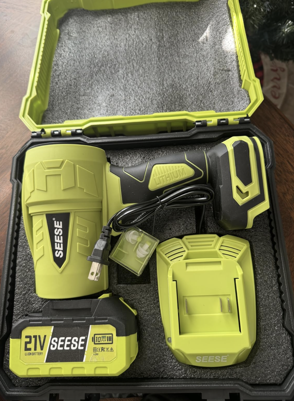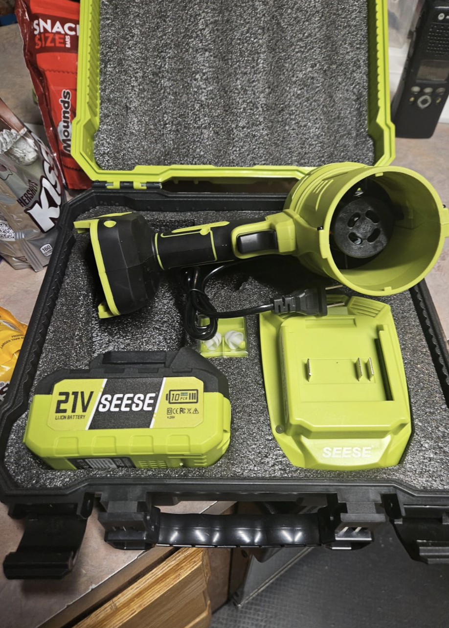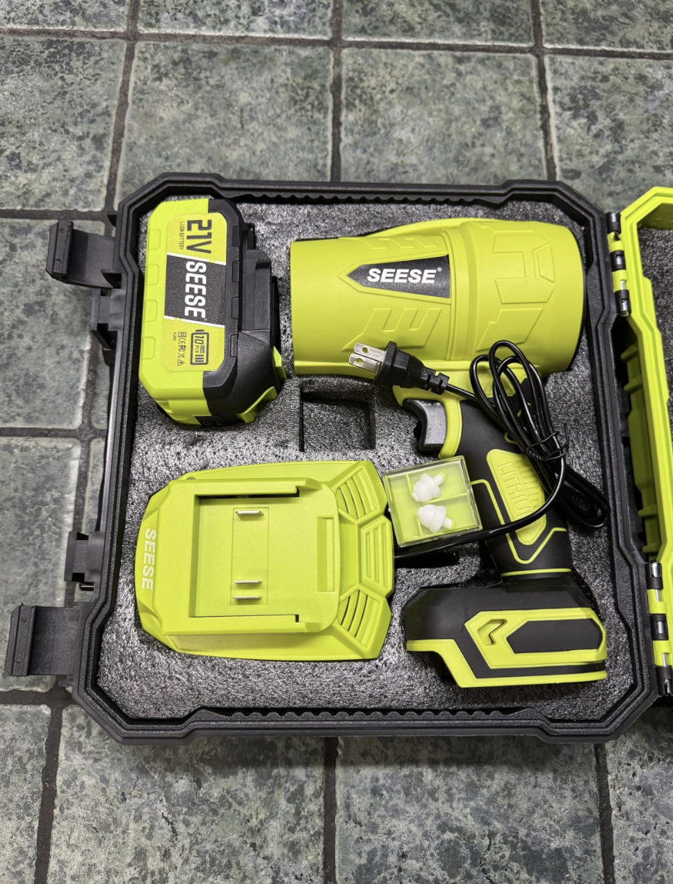 The Seese Pro Blower (1200 CFM, 200 MPH, 2 batteries & case) is a beast for snow removal and garage cleaning. The ultra-light 1000g weight makes it easy to hold overhead for high shelves or car tops. Power blasts snow off my driveway in minutes—no shoveling needed. Case keeps everything organized. Batteries last through big jobs. Ergonomic design reduces strain. This blower is versatile and powerful—great for winter and year-round use!